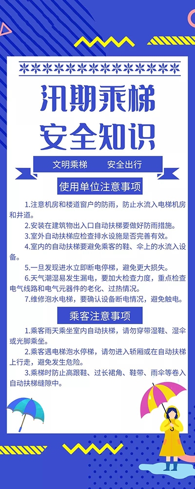 近期,江苏省水利厅升级长江江苏段洪水橙色预警。长江南京下关站最高潮位超警戒水位1.22米,长江水位到达今年入汛以来的最高位!长江大流量、高水位将持续较长时间,防汛形势严峻。南京自入梅以来,雨水多、强度大,根据天气预报,近期我市仍将有明显降水过程。汛期,因电梯电子设备受潮或底坑、井道进水,引发运行故障的概率随之增加,电梯使用单位和乘客应注意以下事项: