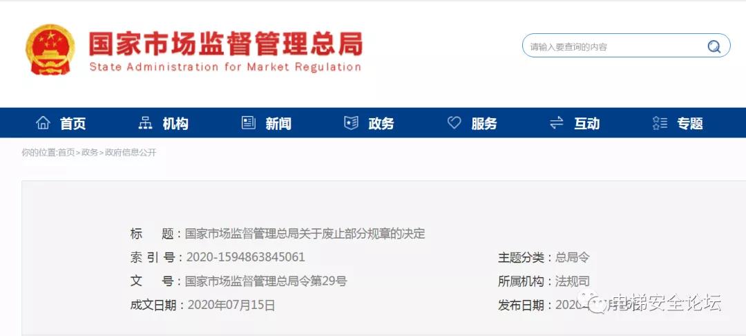 《国家市场监督管理总局关于废止部分规章的决定》已于2020年7月7日经国家市场监督管理总局2020年第5次局务会议审议通过,现予公布,自公布之日起施行。