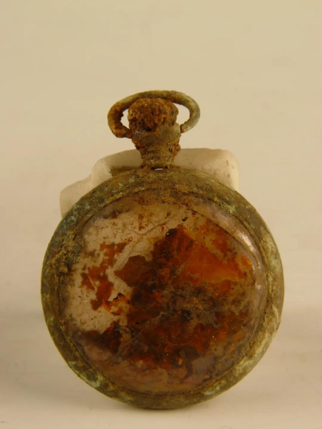 这只怀表于1971年从抚顺平顶山惨案遗址出土,表蒙有明显的裂痕,表盘内已经没有指针。虽然锈蚀严重,但仍能看到被火烧过的痕迹。这只没有指针的怀表,凝固了时间,也凝固了侵华日军的滔天罪行。