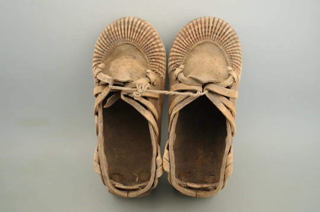 这是一双造型奇特的鞋:鞋面抽成一圈均匀的褶儿,褶儿后面是一个向上凸起的“舌头”,鞋口周边再窜上细细的牛皮带子。这种鞋被称作“靰鞡鞋”,是抗联战士们冬日作战的重要“装备”。靰鞡鞋用厚厚的牛皮缝制而成,既温暖又舒服。