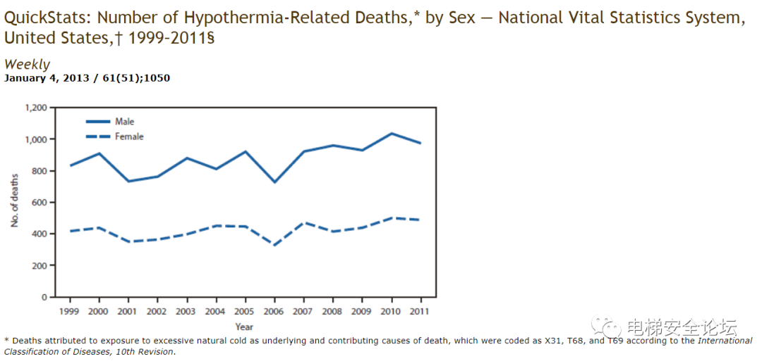 美国1999年至2011年平均每年死于低温症的人数平均达到1301人。