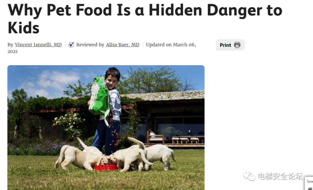 这是一篇提醒家长要注意宠物饲料对儿童造成潜在威胁的文章,文章提醒家长尤其是狗饲料(比较干燥)会导致儿童窒息的危险。