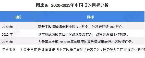 2020年新开工改造城镇老旧小区3.9万个,涉及居民近700万户;到2022年,基本形成城镇老旧小区改造制度框架、政策体系和工作机制;到“十四五”期末,结合各地实际,力争基本完成2000年底前建成的需改造城镇老旧小区改造任务。