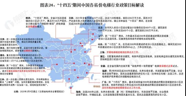 “十四五”期间,我国主要省份也提出了电梯行业相关的发展目标,其中包括老旧小区改造加装电梯以及按需维保新模式的试点推广工作。陕西、吉林、北京、辽宁、山东、福建、广东、海南、四川等省份提出了到“十四五”末完成2000年以前建成的老旧小区该更。上海、深圳、河北等省市提出了按需维保的新模式推广: