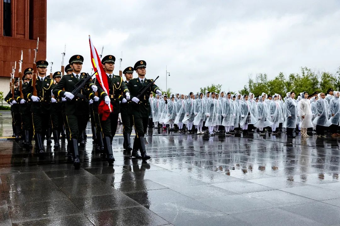 国旗护卫队迈着坚定有力的步伐护送国旗至升旗台,